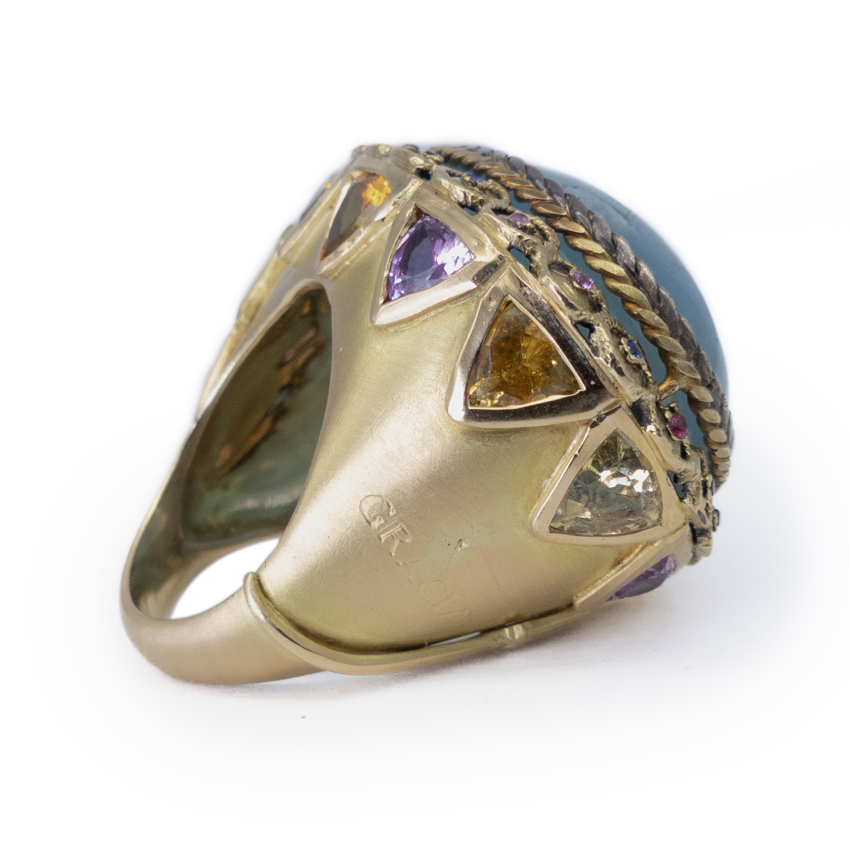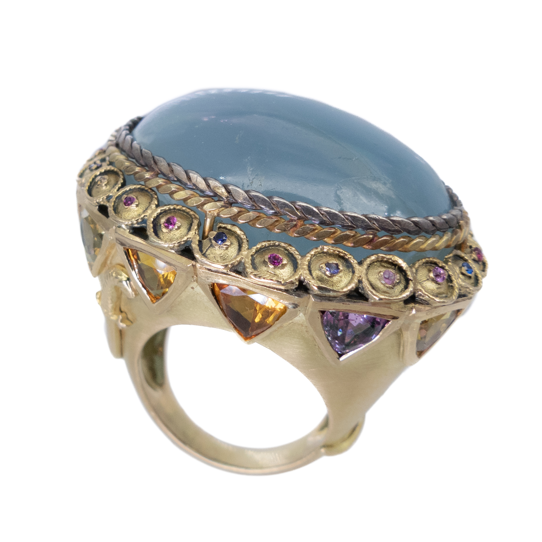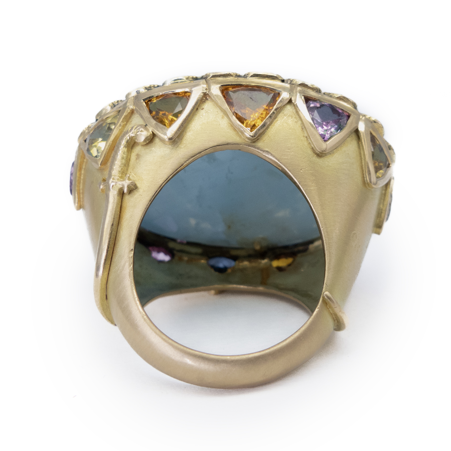 Anillo de oro amarillo de 18k, aguamarina lechosa en talla cabujón central, alrededor del anillo tenemos un zafiro, amatistas, citrinos de colores de talla trillante.