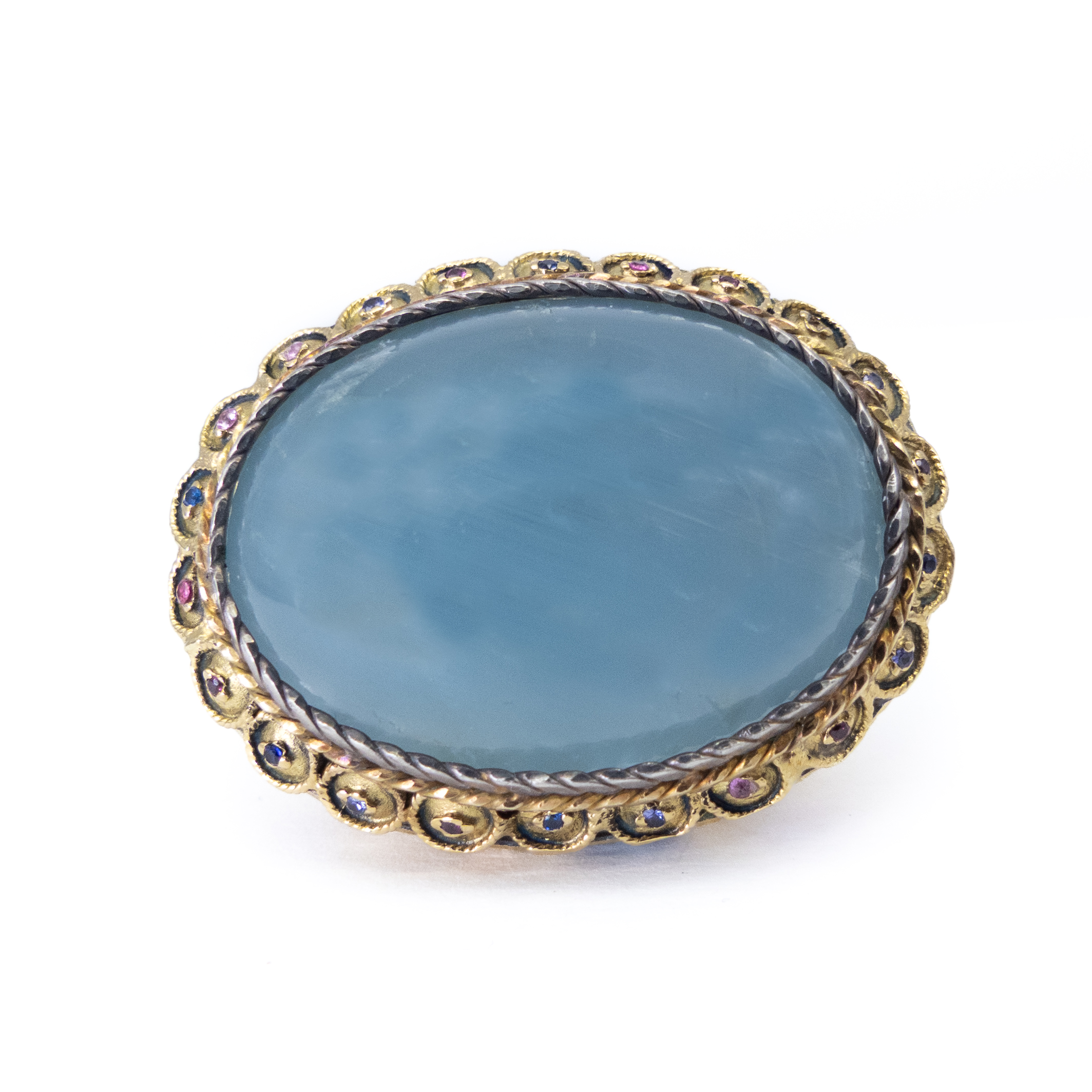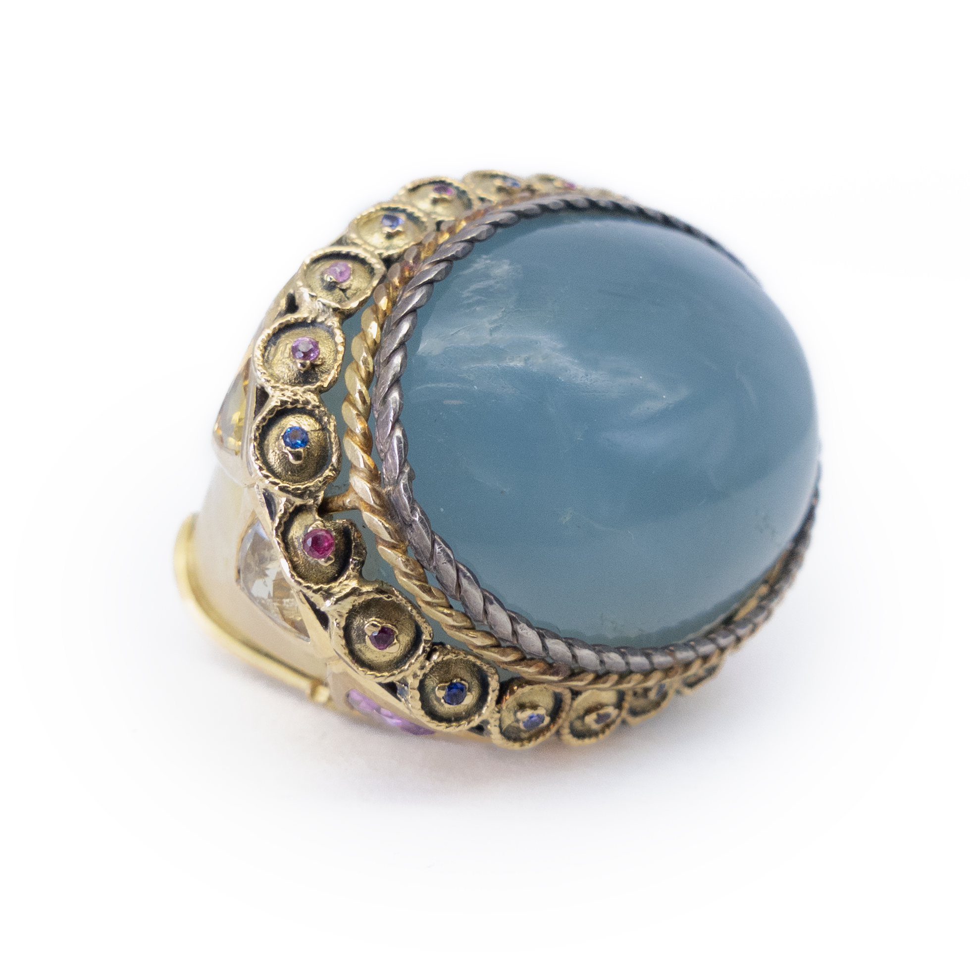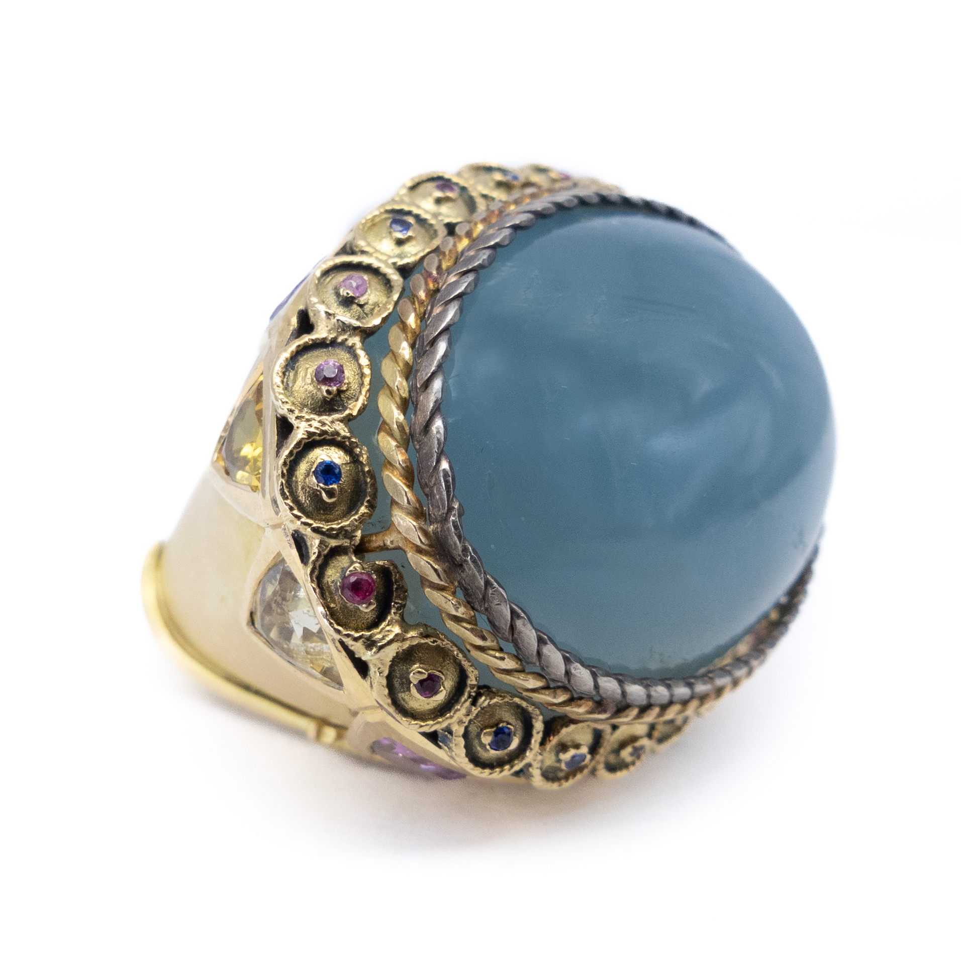 Anillo de oro amarillo de 18k, aguamarina lechosa en talla cabujón central, alrededor del anillo tenemos un zafiro, amatistas, citrinos de colores de talla trillante.