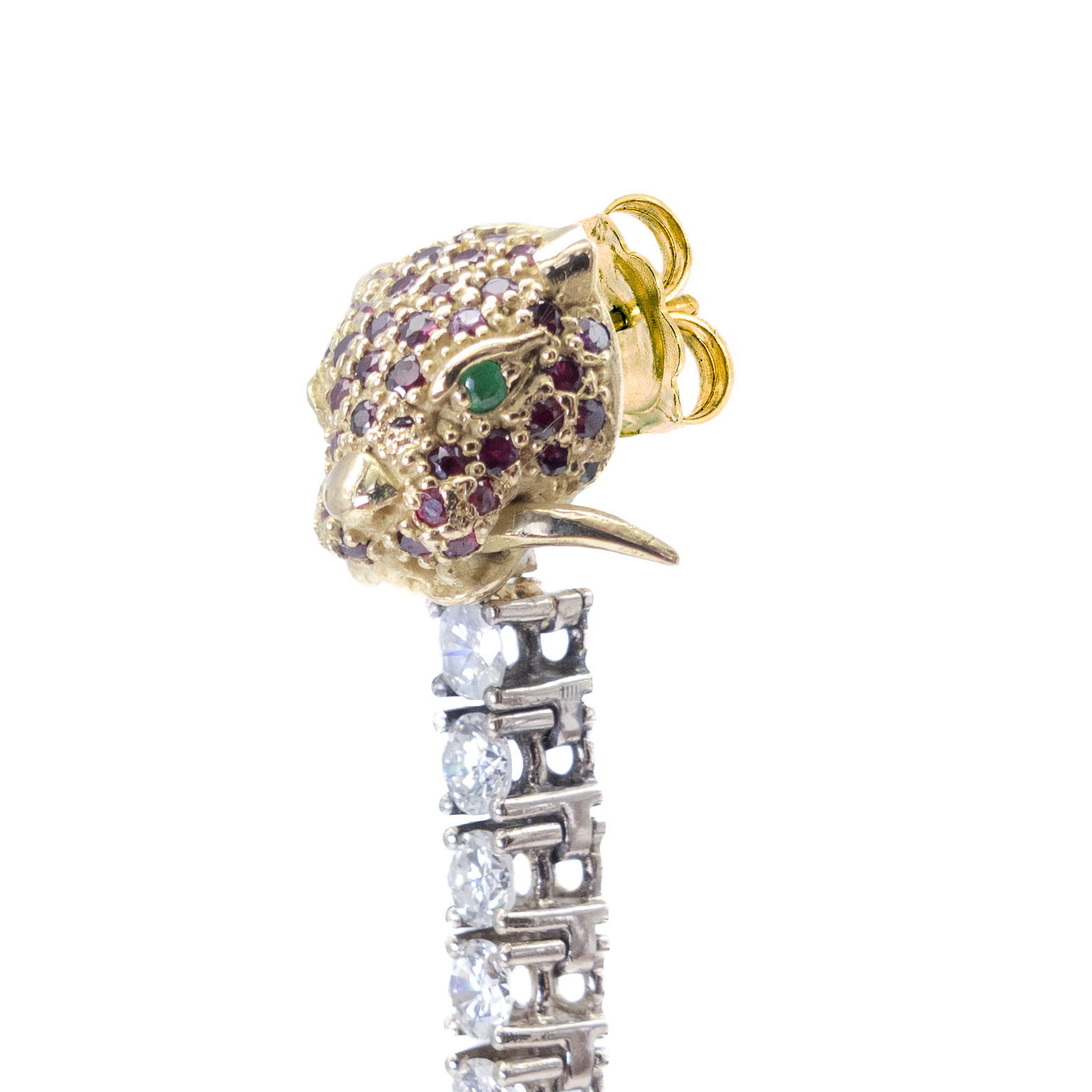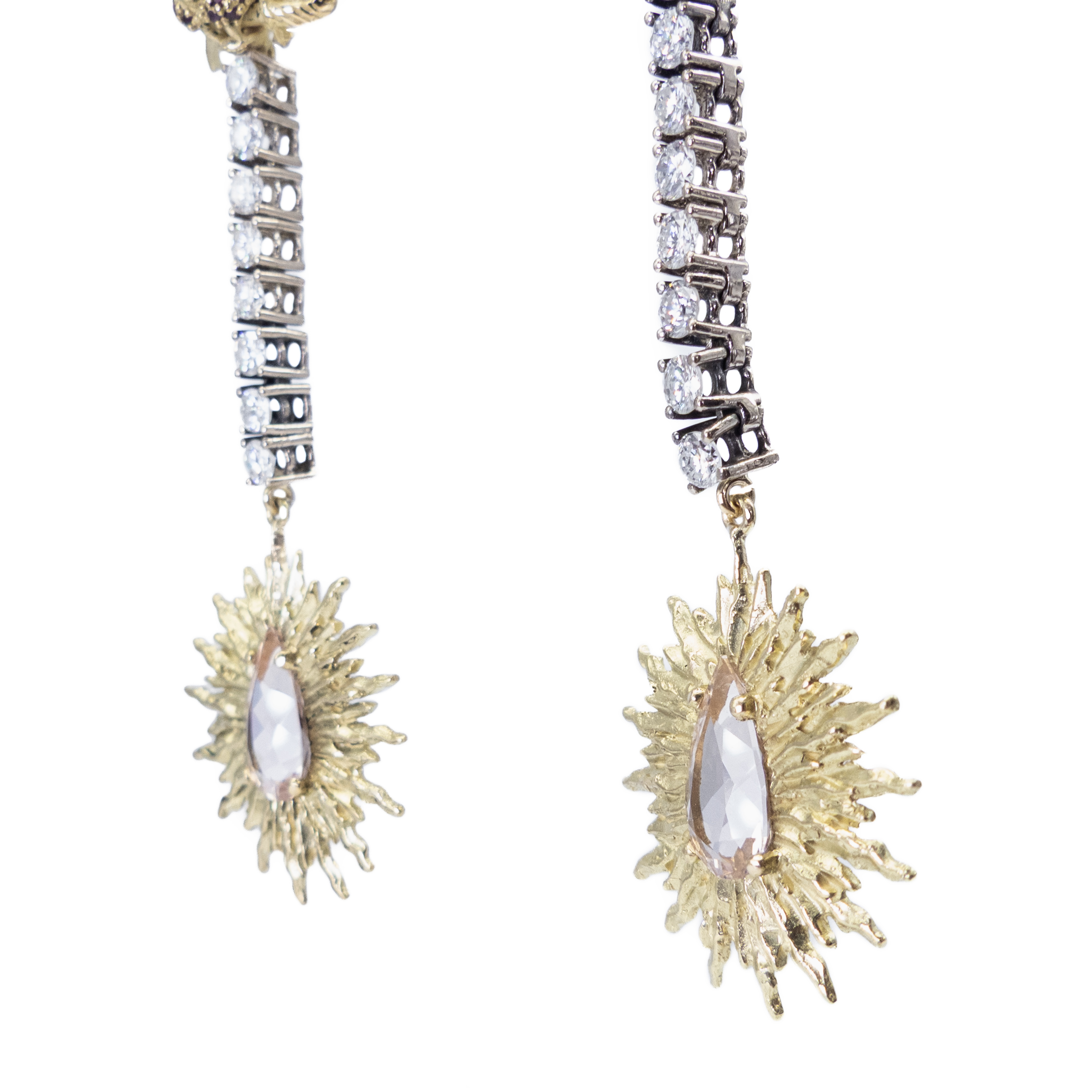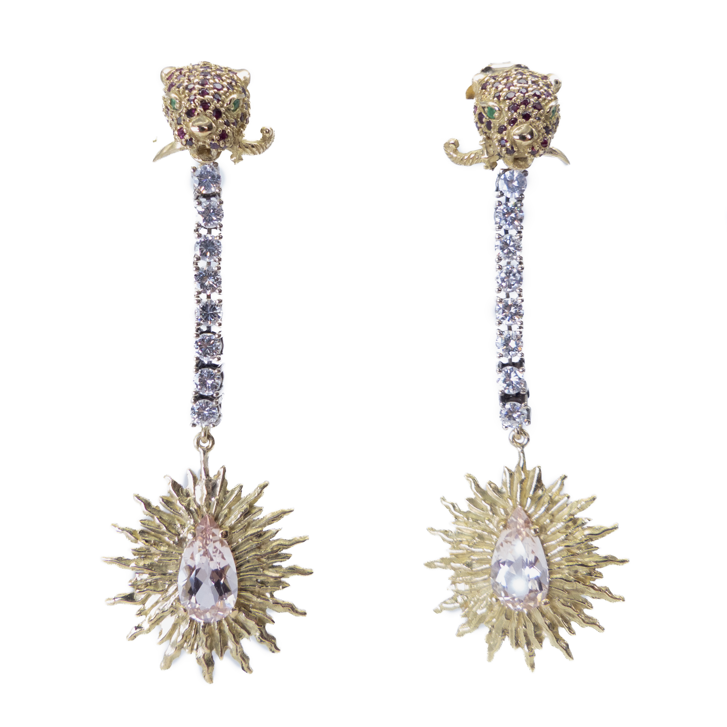Pendientes oro amarillo de 18k, rivière de brillantes en oro blanco, rubíes, diamantes y dos morganitas de 12×6 mm en total 3,42 cts.