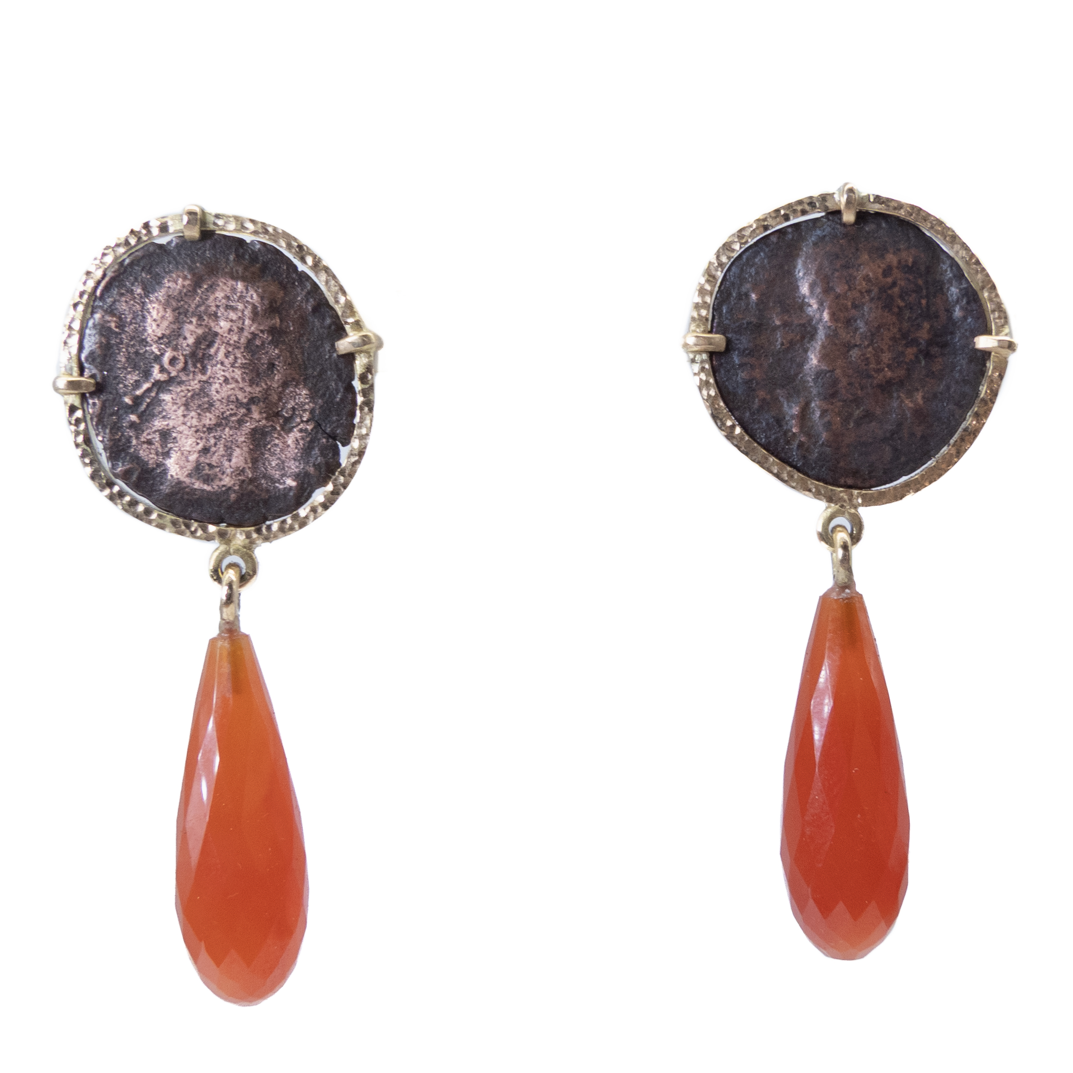 Pendientes de oro amarillo de 18k, sestercios romanos y cornalinas facetadas.