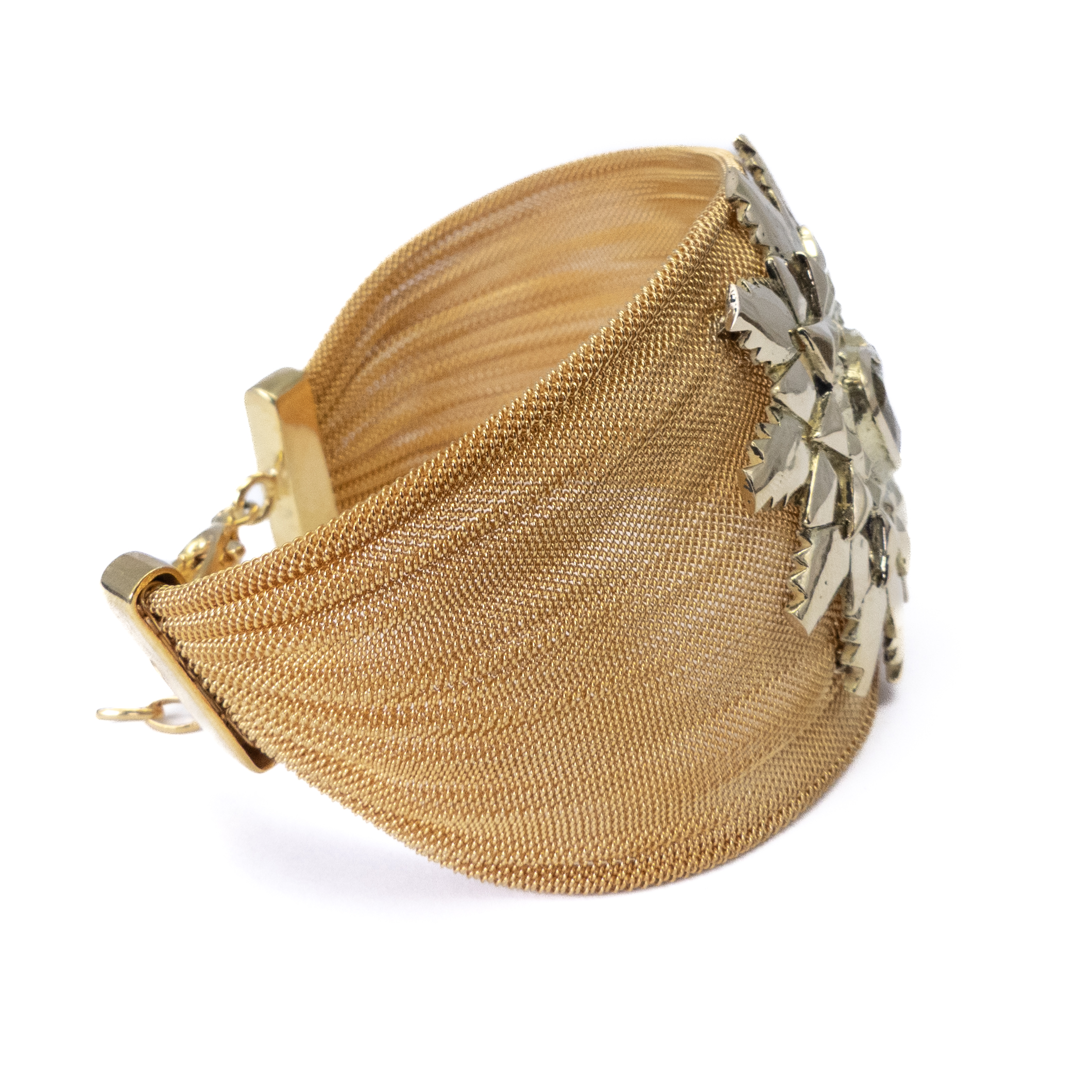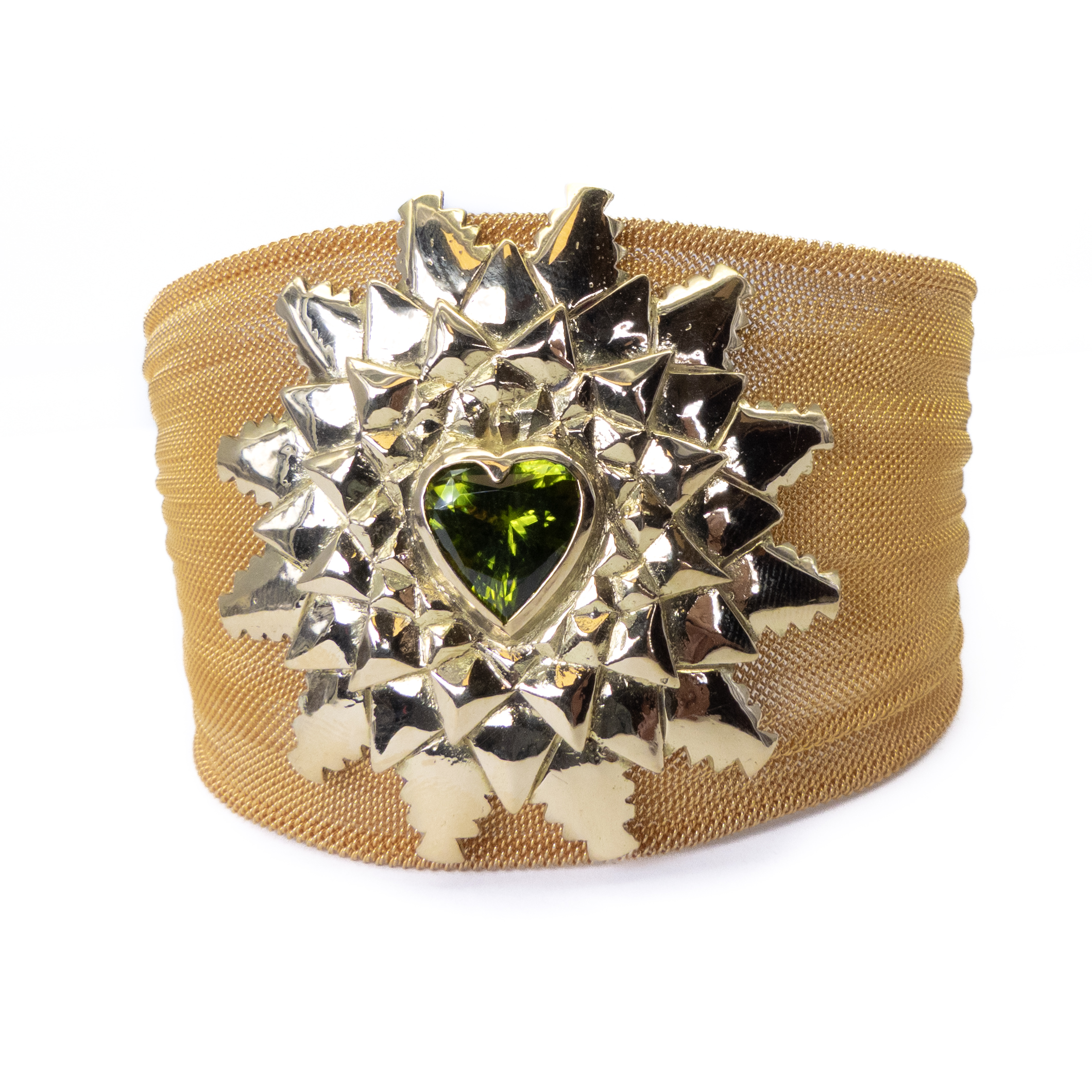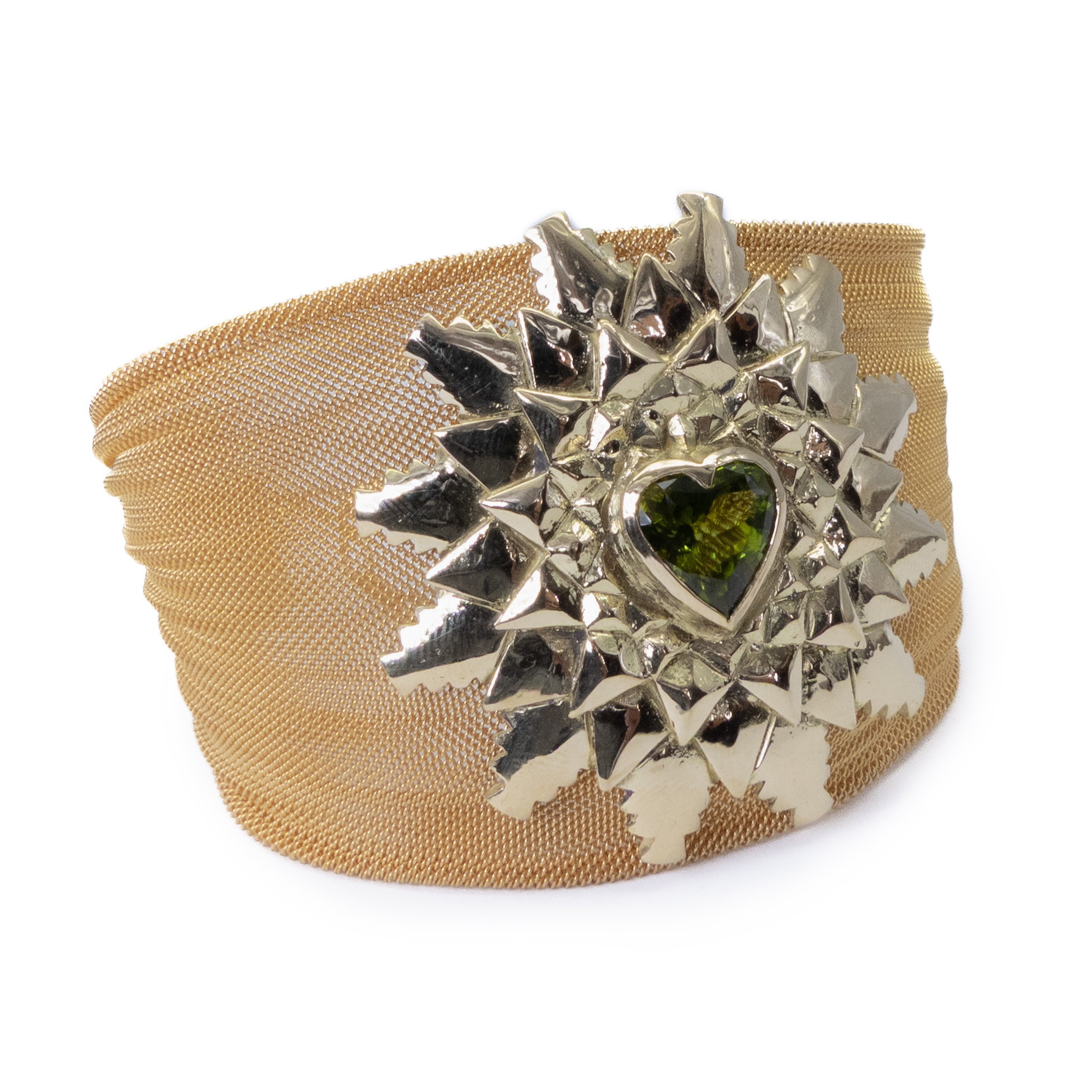 Brazalete de malla de plata con baño de oro, oro amarillo de 18k y periodo tallado en forma de corazón.