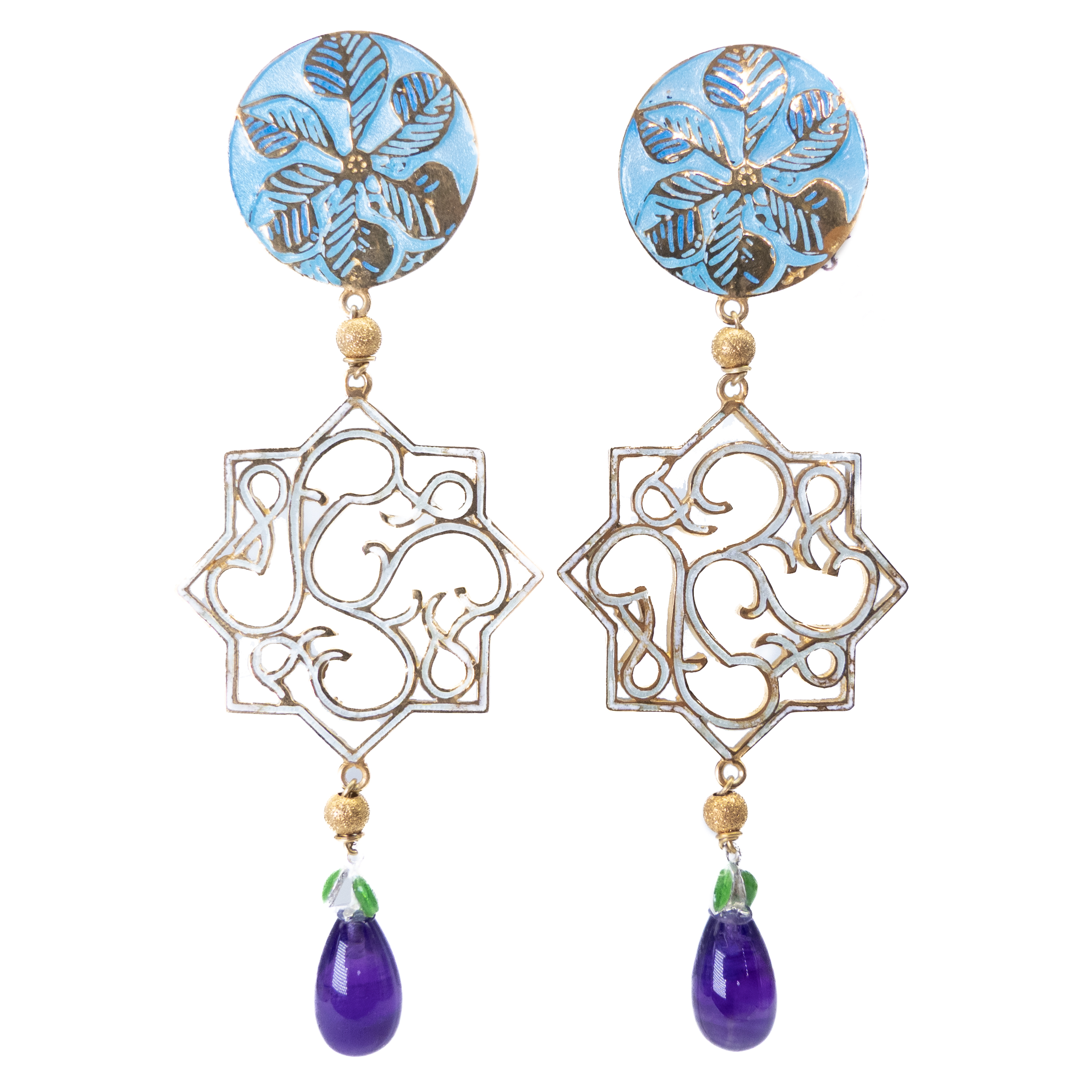 Pendientes de plata con baño de oro, esmaltes al fuego y amatistas.